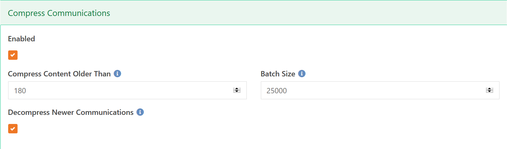 The primary configuration setting is how many days old a communication must be before it is compressed. The default setting is for 6 months, which means any communication that was created within the past 6 months can be viewed just as they are now. Once they reach an age of 6 months (or whatever number of days you specify) they will be compressed. When that happens, the actual message content is compressed and archived. In it's place will be a button that users can click to decompress the message and view it. When the automation job next runs the communication will be re-compressed.