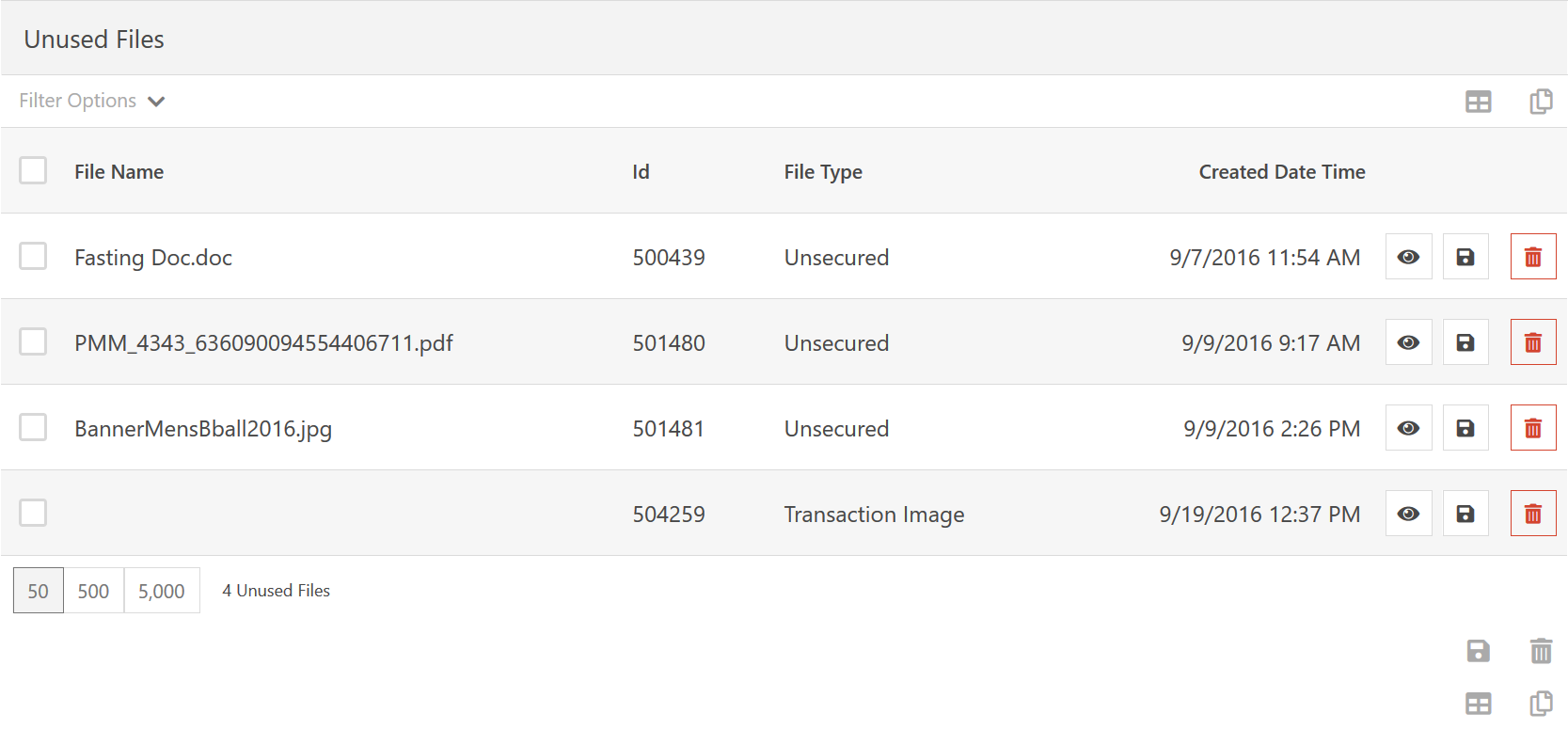 Now then, there are a few buttons in the grid you are not familiar with. The first button is the eye. This allows you to view the file in question. Next to it is the save button with the floppy disk on it. Clicking this will add a record to a special Defined Type that will reference the binary file. This prevents the file from showing up on the unused files list in the future, since it is now referenced. Lastly you have the trash button. This will either delete or quarantine the file, depending on the block settings.