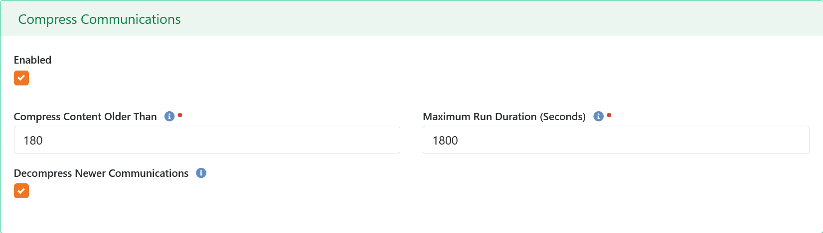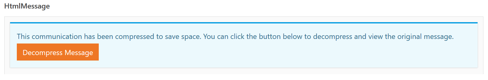 The primary configuration setting is how many days old a communication must be before it is compressed. The default setting is for 6 months, which means any communication that was created within the past 6 months can be viewed just as they are now. Once they reach an age of 6 months (or whatever number of days you specify) they will be compressed. When that happens, the actual message content is compressed and archived. In it's place will be a button that users can click to decompress the message and view it. When the automation job next runs the communication will be re-compressed.