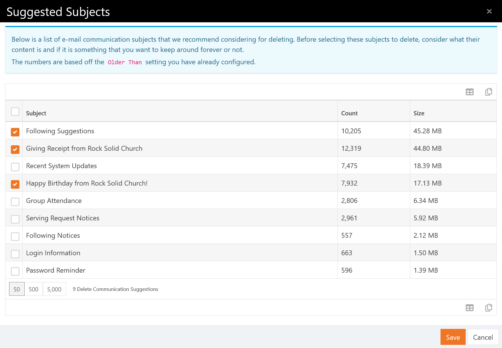 Along with each subject found, the number of communications will be displayed and the (estimated) storage space that is being used by all those communications. Tic any check-boxes on the rows you want to include and then click the Save button in the dialog to add those selections to the subject lines already entered.