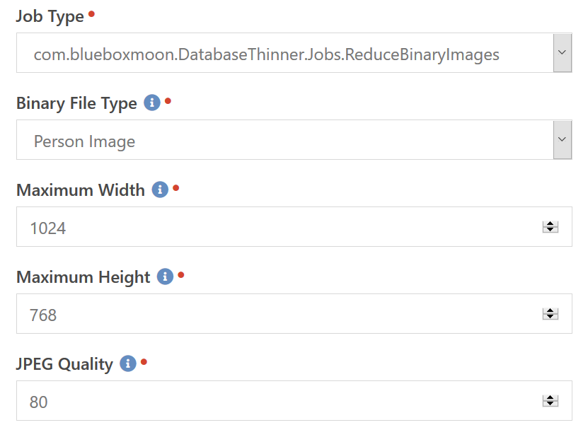 This job allows you to take care of those images that have already been uploaded. Add as many of these jobs as you need to handle compressing various file types. Each job instance allows you to specify the file type and the maximum resolution. If any file is beyond these dimensions then it will be shrunk down to fit within these maximum dimensions.