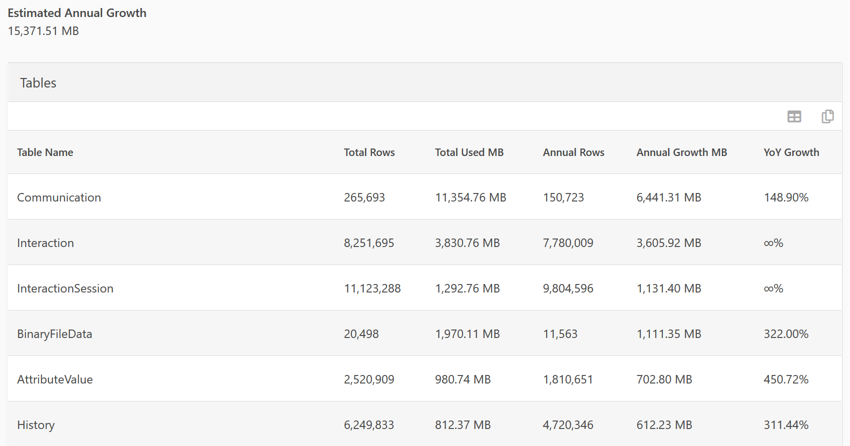 Any YoY Growth that is infinity, means there is not enough data to estimate the Year over Year growth. In the example above, the "Interaction" and "InteractionSession" tables are newly added to Rock and we can't calculate the Year over Year values, because the data has not been around for two years.