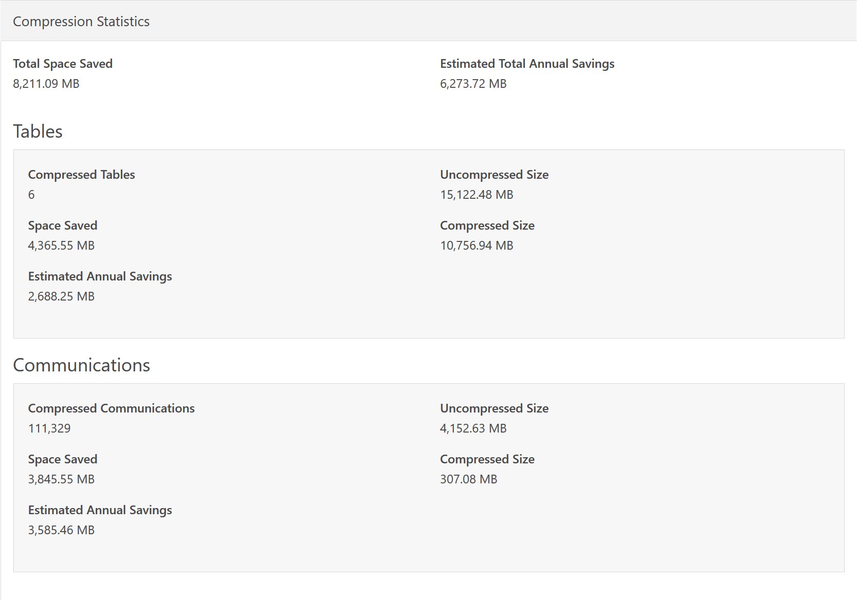 This page will scan the compressed data and display savings information. The two pieces that are scanned are the compressed Communications and any compressed SQL tables. While the Communication numbers are exact, the table numbers are estimated. The only way to display exact numbers would be to decompress and then re-compress the tables to find out the exact sizes. So while the Compressed Size values are exact, the Uncompressed Size values are only estimates.