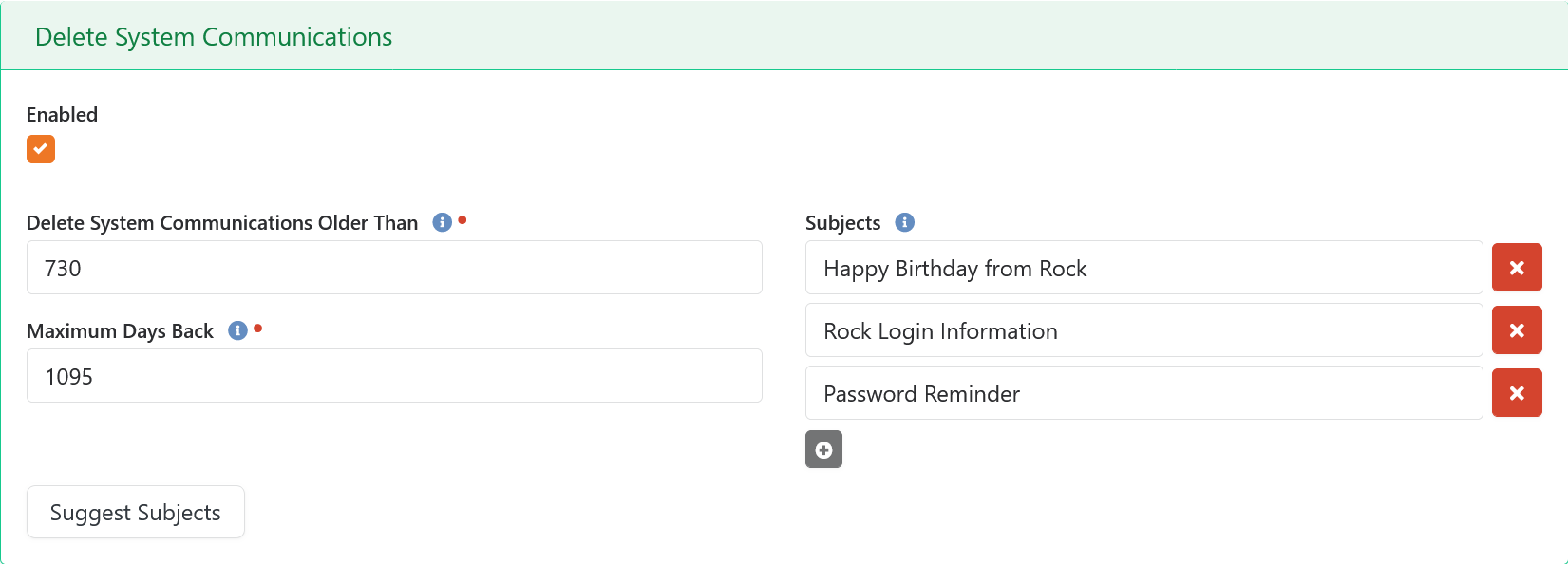 Three different qualifications must be met for a system communication to be deleted. The first is that it must be older than the Delete Communications Older Than value, in days. The second is that it must be not be older than Maximum Days Back. The third is that the subject must exactly match one of the Subjects values. You can manually enter subjects yourself, but why bother doing it manually? The Suggest Subjects button will scan the database and make recommendations on which subjects are likely system e-mails and might be good candidates for deletion.